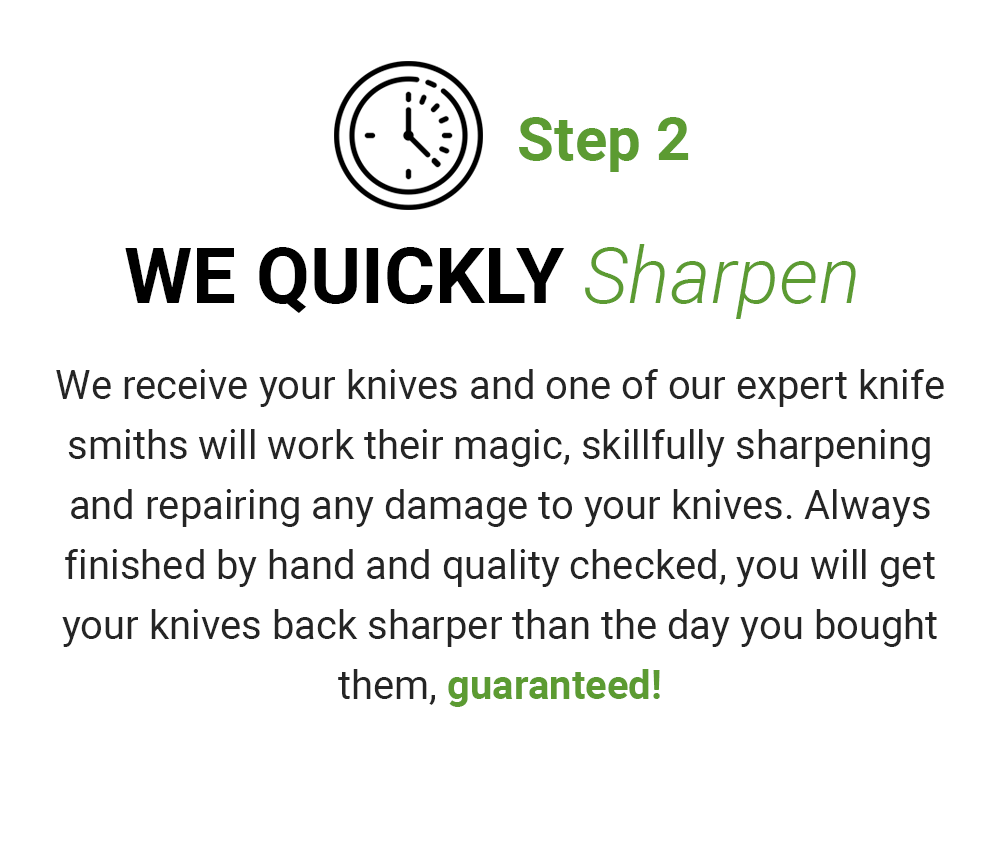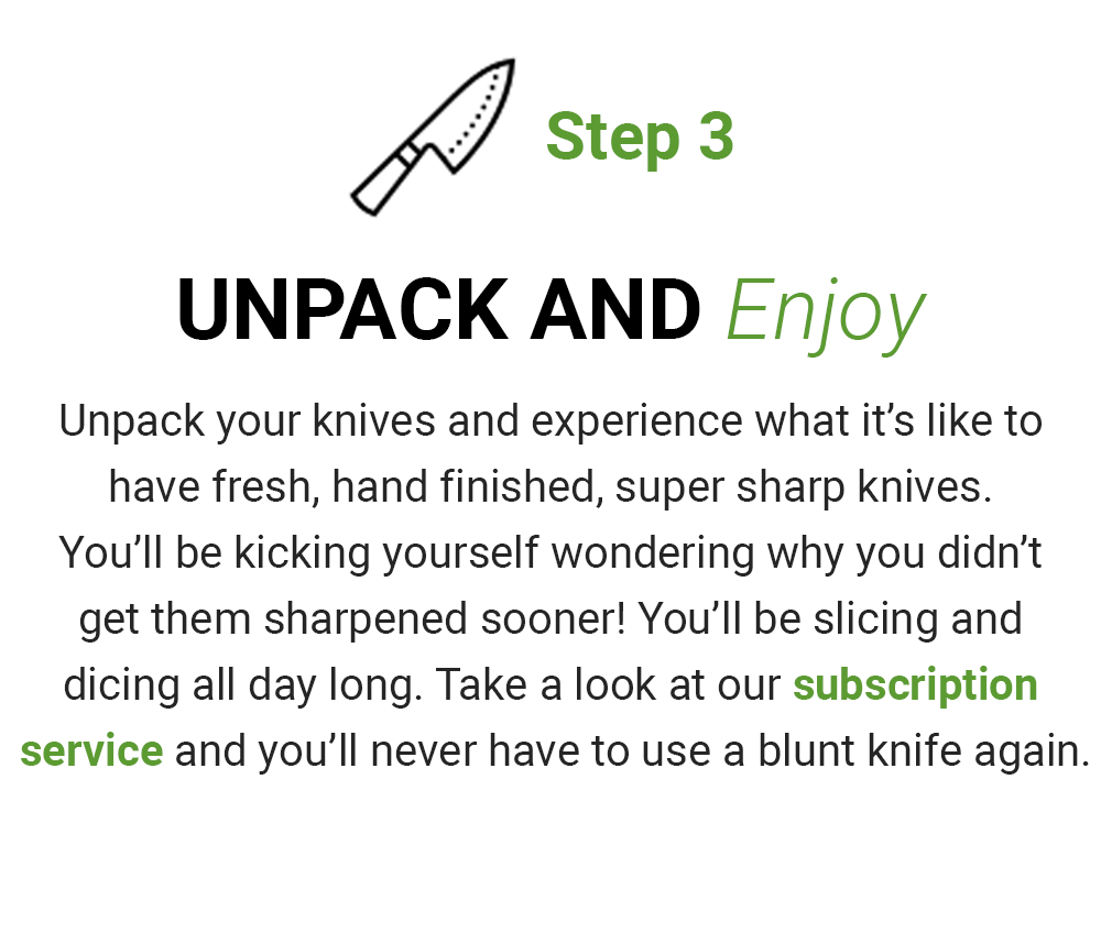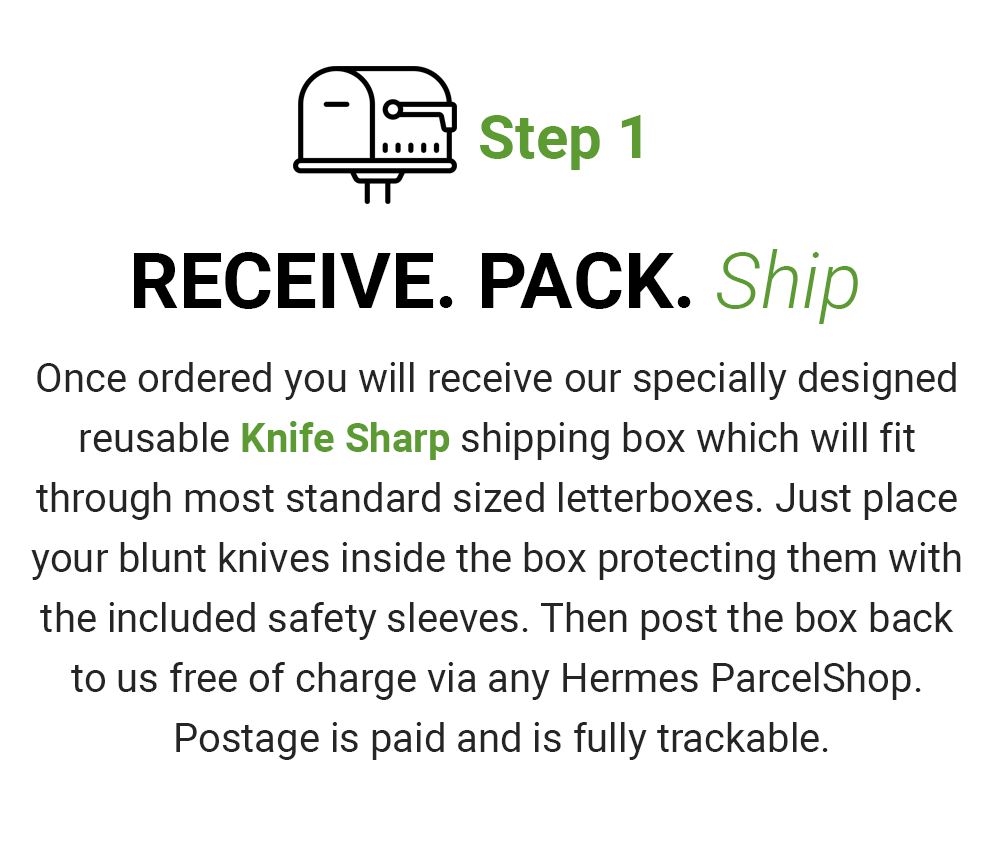 Just pick the number of knives you need sharpened and/or repaired (all repairs are free of charge) and our specialised knife shipping box will be en route to you the very same day.